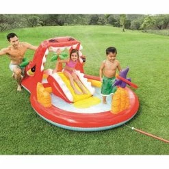 Cette aire de jeux gonflable et facile Ă installer permettra Ă vos enfants de s’amuser et se rafraĂ®chir en sĂ©curitĂ© dans un univers d’Ă®le prĂ©historique.