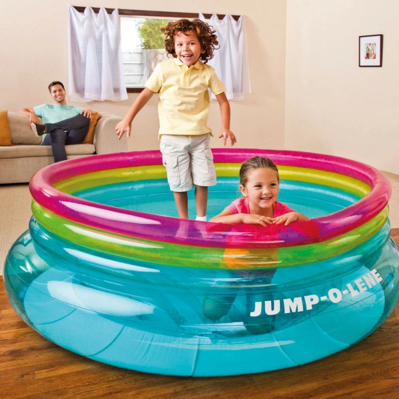 Trampoline gonflable pour enfant avec fond gonflable. Parfait pour 2 enfants entre 3 et 6 ans. Le poids maximum accepté est de 54 kg.